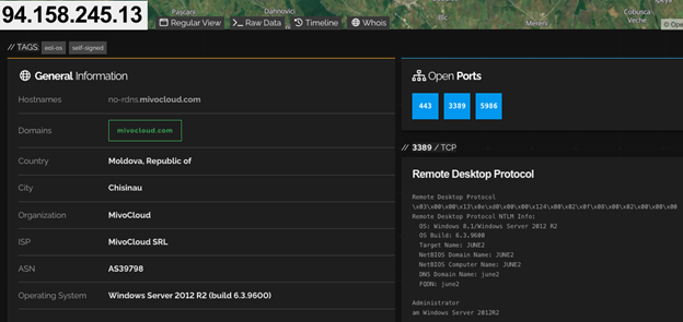 After the victim completes the fake verification process, a batch file containing NetSupport Manager Client files is downloaded from hxxps://2beinflow[.]com/head.php to the victim’s system (C:ProgramDatajh.bat), where it is executed. The batch file retrieves a ZIP archive, saves it as C:ProgramDataloy.zip, and then writes the extracted files into C:ProgramDataDisy. The batch file then launches the NetSupport Manager Client application (client32.exe) and establishes persistence by creating a registry Run key. Although NetSupport Manager is a legitimate remote access tool, it is often referred to as NetSupport RAT due to its popularity with threat actors. CTU™ researchers observed the NetSupport RAT connecting to a command and control (C2) server at 94[.]158[.]245[.]13. As of this publication, this IP address is associated with a Windows Server 2012 operating system and exposes ports 3389 (RDP), 443 (HTTPS), and 5986 (WinRM) (see Figure 4).